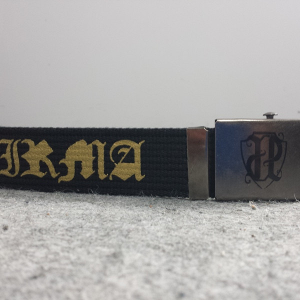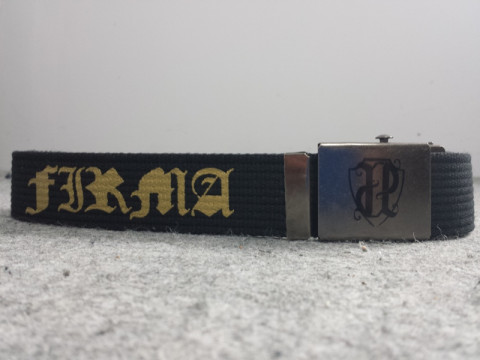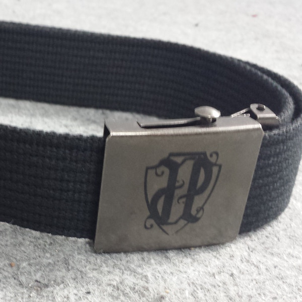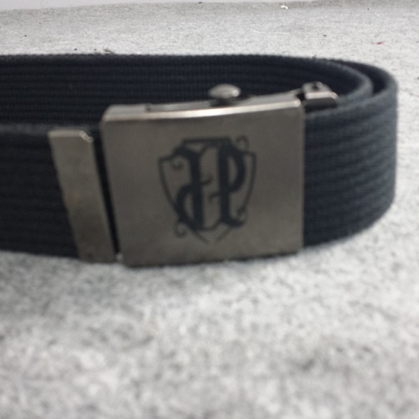 -czarne logo na klamrze, duży napis firma na końcu paska, wewnetrzne logo JP